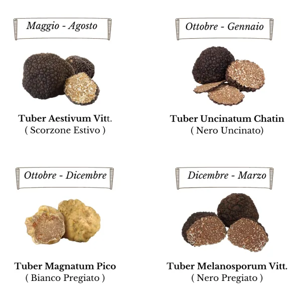 Seleziono solo i migliori tartufi bianchi (Tuber magnatum Pico), neri pregiati (Tuber melanosporum), uncinati (Tuber uncinatum) ed estivi (Tuber aestivum), raccolti e scelti uno ad uno per garantirti qualità, tracciabilità e un sapore autentico.